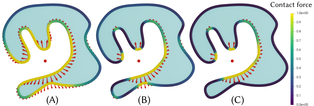 Contact forces (arrows) and potential distribution on a 2D object surface with respect to the red dot. (A) The IPC potential distributes spherically regardless of surface shape. (B) With the local minimum constraint, only surfaces near local minima/maxima of distance have high potential. (C) With both local minimum and exterior direction constraints, only the closer side of the volumetric object has nonzero potential.¶