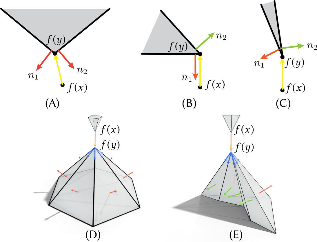2D (top) and 3D (bottom) normal directions for contact points. The displacement \(f(y) - f(x)\) is shown in yellow; face normals \(n_i(y)\) are shown in red when the exterior constraint is satisfied, and green otherwise. In simple cases such as (A) and (D), all normals satisfy the constraint, but in general only some do.¶
